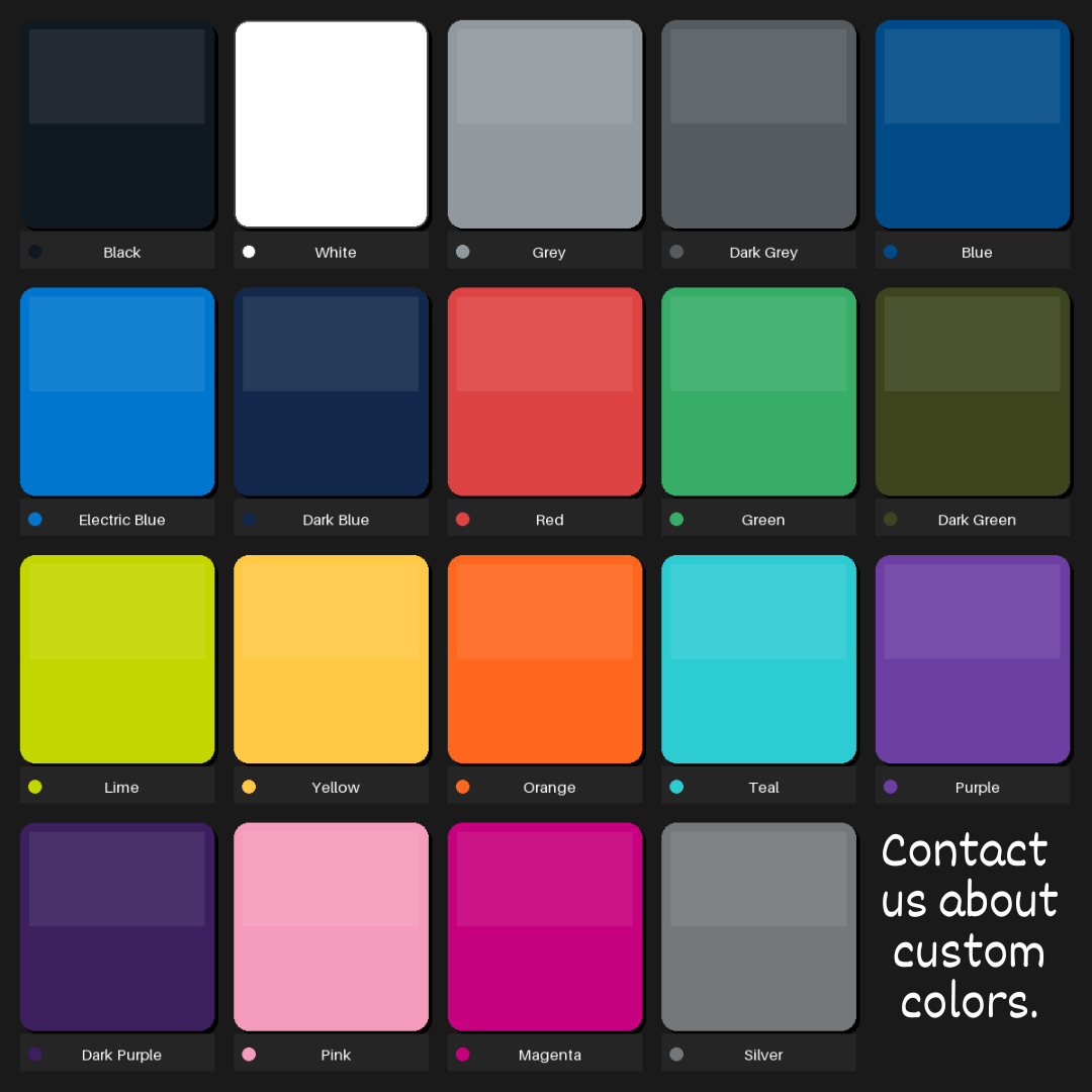 Made with Polymaker™ PETG filament in 19 colors: Black · White · Grey · Dark Grey · Blue · Electric Blue · Dark Blue · Red · Green · Dark Green · Lime · Yellow · Orange · Teal · Purple · Dark Purple · Pink · Magenta · Silver